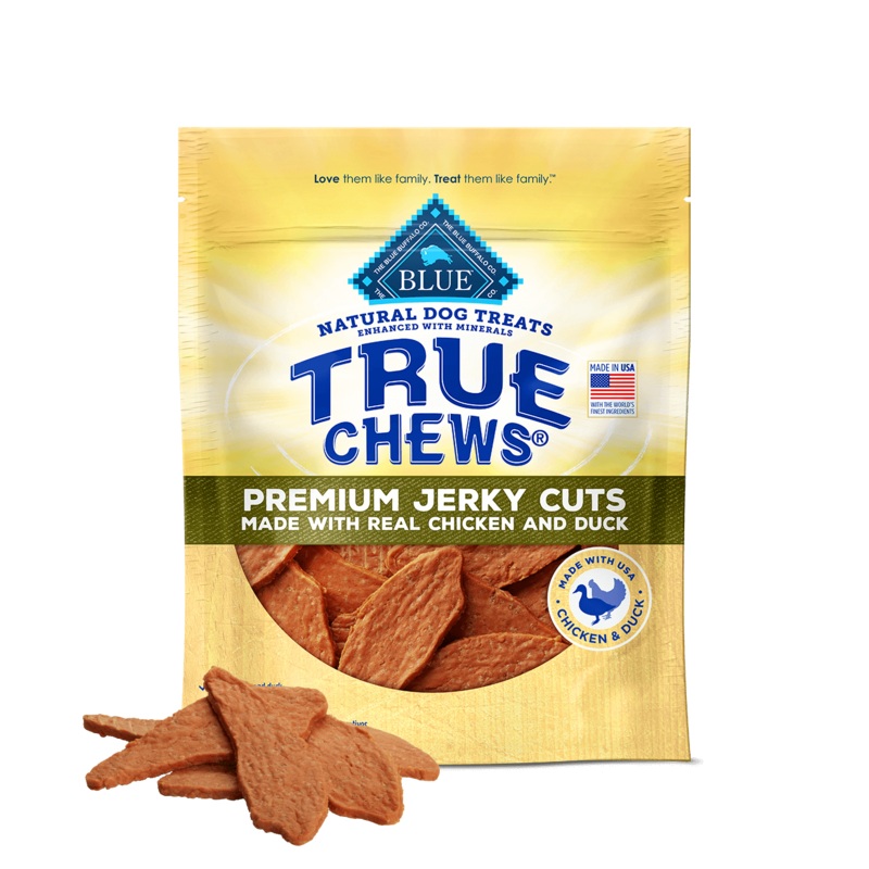 Give your dog a deliciously satisfying jerky treat with BLUE True Chews Premium Jerky Cuts. Made in the USA with just a few simple ingredients starting with real chicken and duck, these irresistibly meaty jerky cuts are a healthy treat youll feel good about giving.