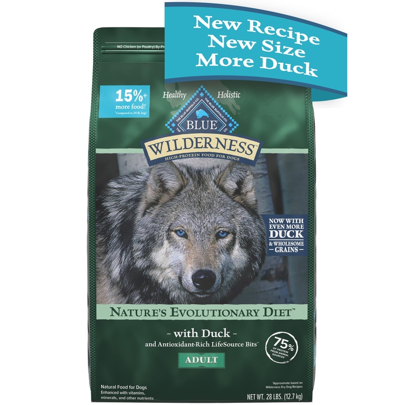 Premium, high-protein BLUE Wilderness is the protein-rich food your dog was born to love. Created to satisfy the same innate cravings as our dogs wolf ancestors, this food starts with the delicious duck your dog desires and contains wholesome grains for an