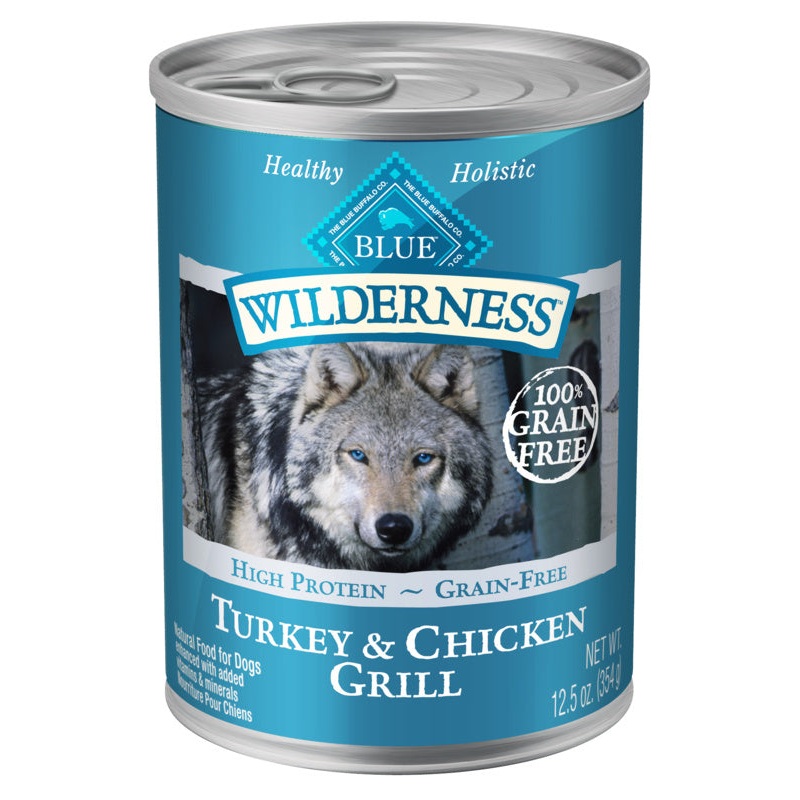 Packed with more of the meat dogs love and free of the grains that contain gluten, BLUE Wilderness wet dog food is made to feed your dogs wild side. With real turkey and chicken, plus fruits and vegetables, this grain free recipe features the finest natura