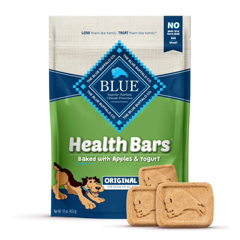 Tasty and wholesome BLUE Health Bars with Apples and Yogurt have a crunchy texture your dog will love. Wholesome whole grains and nutritious fruits work together to help keep him healthy.NO chicken (or poultry) by-product mealsNO artificial flavors or pres