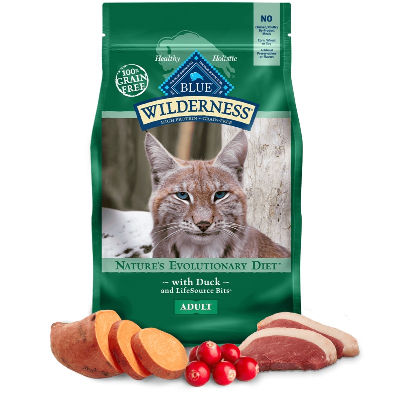 Inspired by the spirit of the lynx, a wild relative of our feline friends, high-protein BLUE Wilderness contains delicious, protein-rich deboned duck, plus healthy ingredients including sweet potatoes, cranberries and blueberries.Grain-freeNO chicken (or p