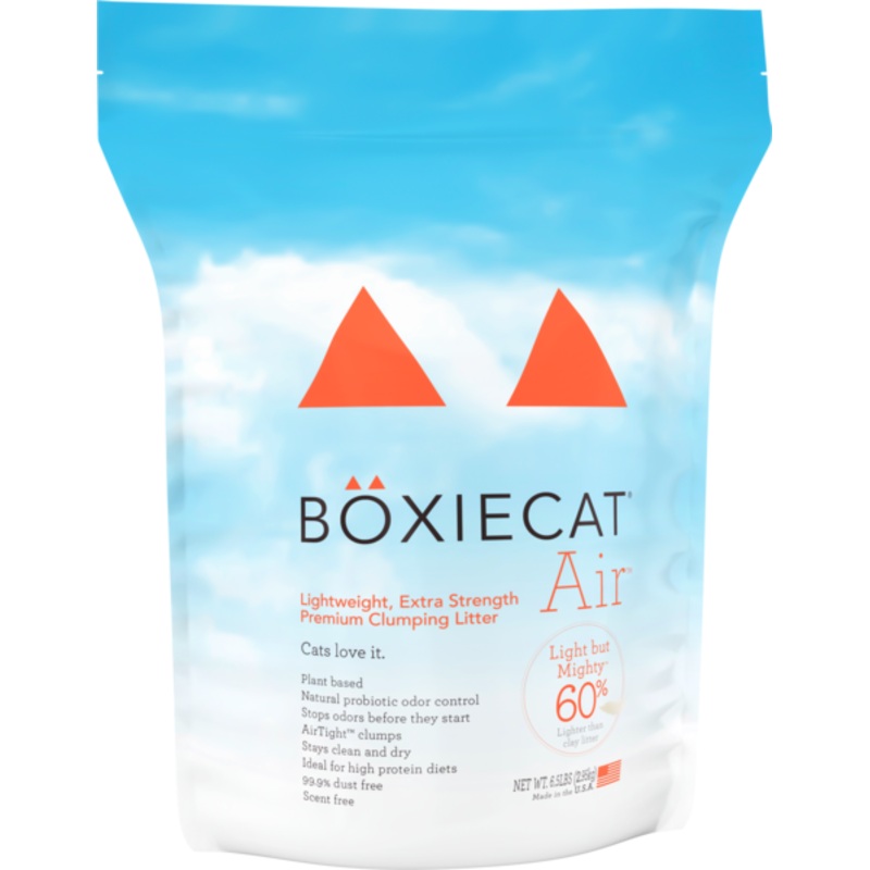 Boxiecat Air litter is light on what you dont want but mighty on what you need because we believe you should experience lightweight litter without compromising on performance. AirTight clumps lock in odors, scoop easily, and dont crumble. Enjoy a super clean litter box while saying goodbye to weight, odors, and dust. Boxiecat Air is plant based, renewable, biodegradable, sustainable, and USA sourced.