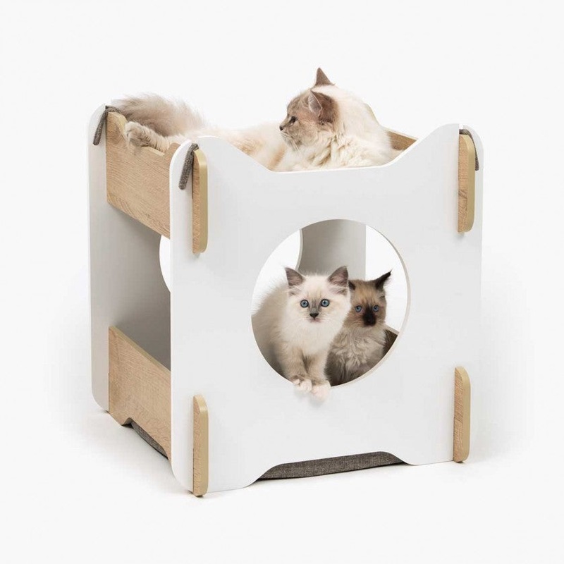 2-Level Hideout with HammockEasy assembly no tools requiredRelaxing hammockComfortable cushionCozy hideout with multiple entrancesHigh-quality MDF with oak and white laminate finishGet your sunshine on with the Vesper Cabana!This two-toned piece of cat fur