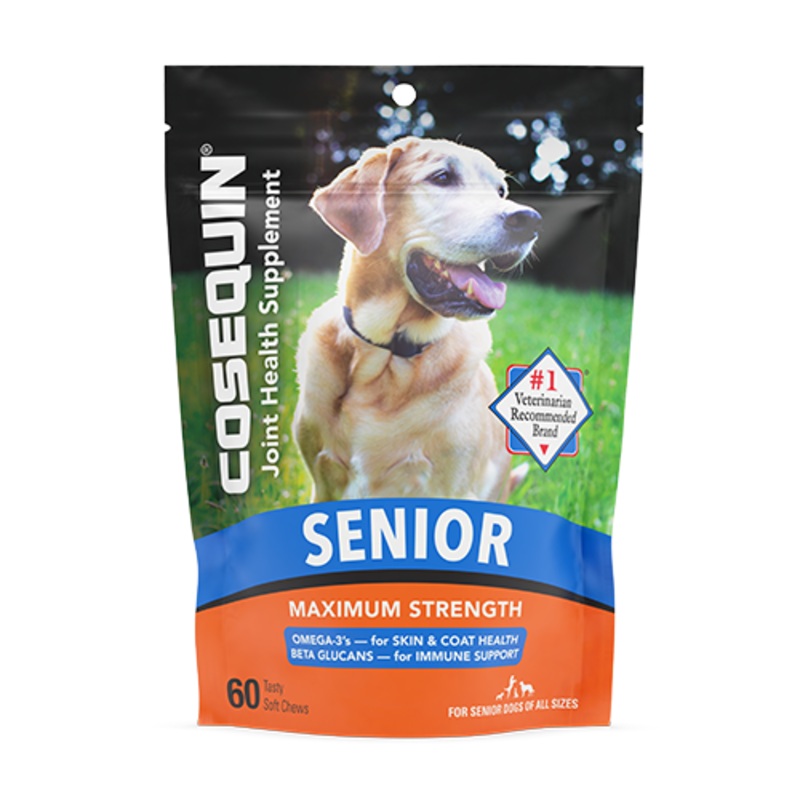 CosequinSenior Max Strength contains FCHG49Glucosamine Hydrochloride, TRH122Sodium Chondroitin Sulfate, and MSM (Methylsulfonylmethane). This combination of ingredients helps maintain your dogs cartilage and connective tissue. Each soft chew also contains omega-3 fatty acids to help support skin & coat health and beta glucans to provide your senior dog with immune health support.