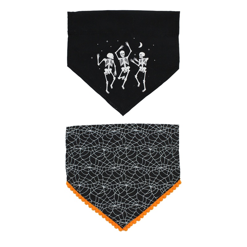Add a touch of whimsical romance to your pup’s wardrobe this Halloween with the enchanting 2pk Dancing Skeletons Bandanas. Each design captures the playful spirit of Halloween with dancing skeletons that waltz their way into hearts and spiderwebs that weave a spell of charm. Crafted with soft, comfortable material, these bandanas are perfect for those magical moments. Whether it’s a festive walk under the moonlight or a cozy evening on the couch, let your furry friend shine with a touch of eerie elegance. Features two bandanas with vibrant patterns that get into the spirit of the Halloween season.