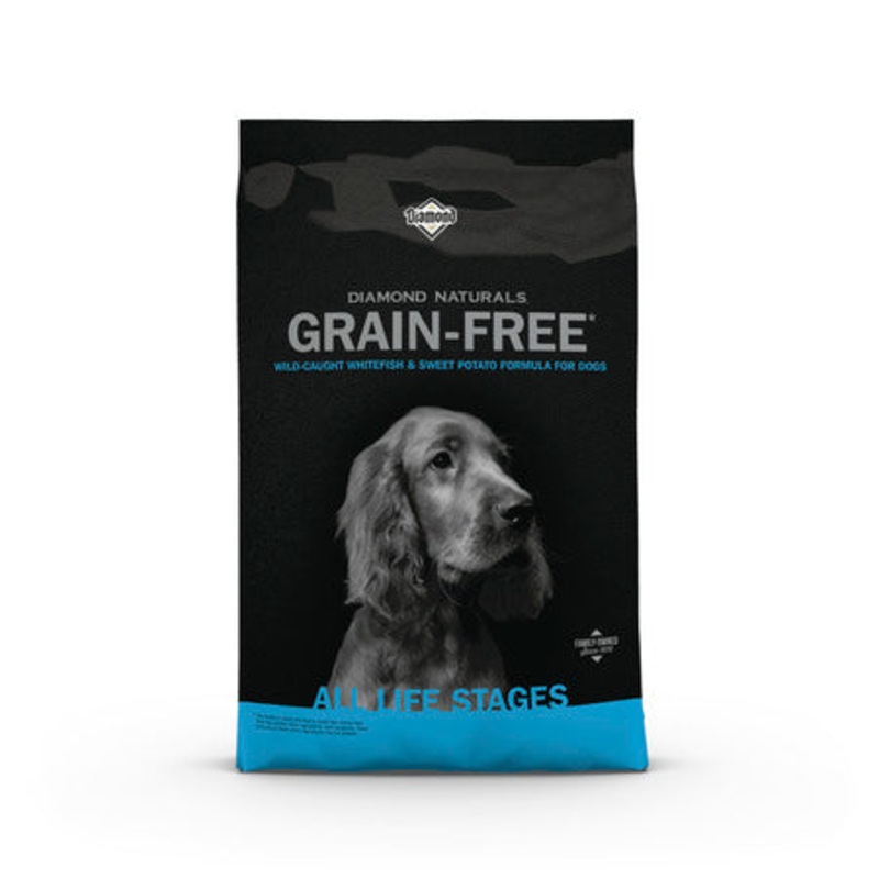 A protein-based diet free of grains most closely mimics a dogs ancestral diet. Thats why the first ingredient in this Diamond Naturals Grain-Free formula is real fish for great taste and nutrition. Sweet potatoes provide complex carbohydrates for all-day energy, while vegetables and fruits add powerful antioxidants for health and vitality.