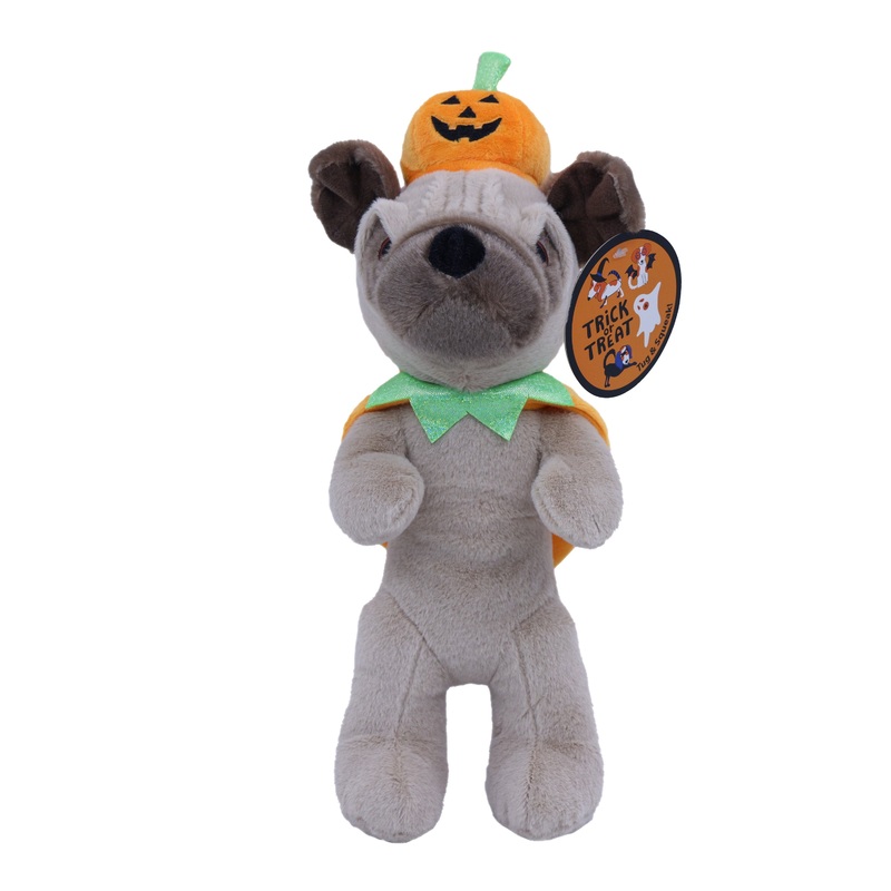 Your pups new howlin Halloween buddy! This adorable plush pup is dressed to impress in a full pumpkin costumecomplete with a jack-o-lantern hat, glittery green collar, and a bright orange cape. Whether its spooky season or your dog just loves a squeaky good time, this costumed canine is ready for tricks and treats.