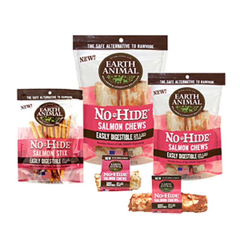 EARTH ANIMAL NO-HIDE SALMON CHEWSEasily Digestible Pure & Healthy, Wild Caught Salmon.We did it! At last, a healthier, better alternative to Rawhide. No-Hide Chews gives new meaning to dog treats. When it comes to our true core values, we insist on quality