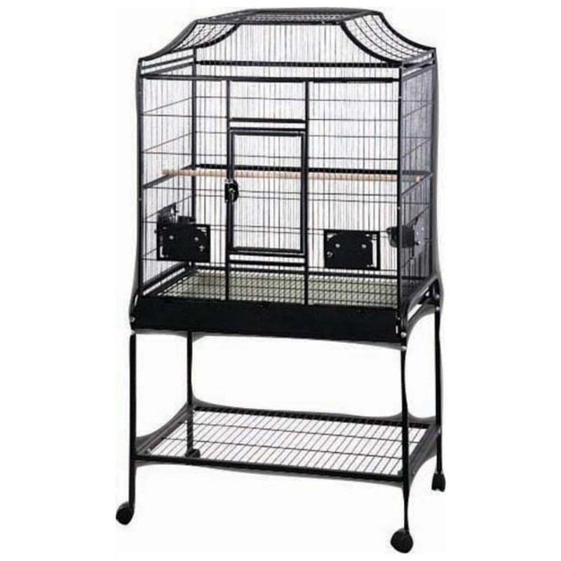 Wrought iron construction with a durable and safe powder coating finish.Horizontal side bars, vertical bars front & back, 4 swing-out feeder doors, 2 wood perches, 4 feeder cupsLarge front door with safety latch for easy accessSlide-out metal grill and pla