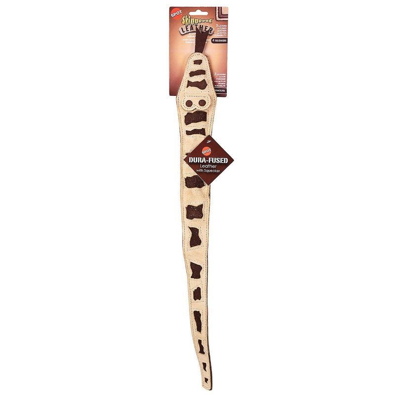 Stuffing free and super durable leather lizard. 25" of slithery fun! 3 layers of fused leather for extra durability. Natural leather scent dogs can't resist. 2 squeakers for double the fun.