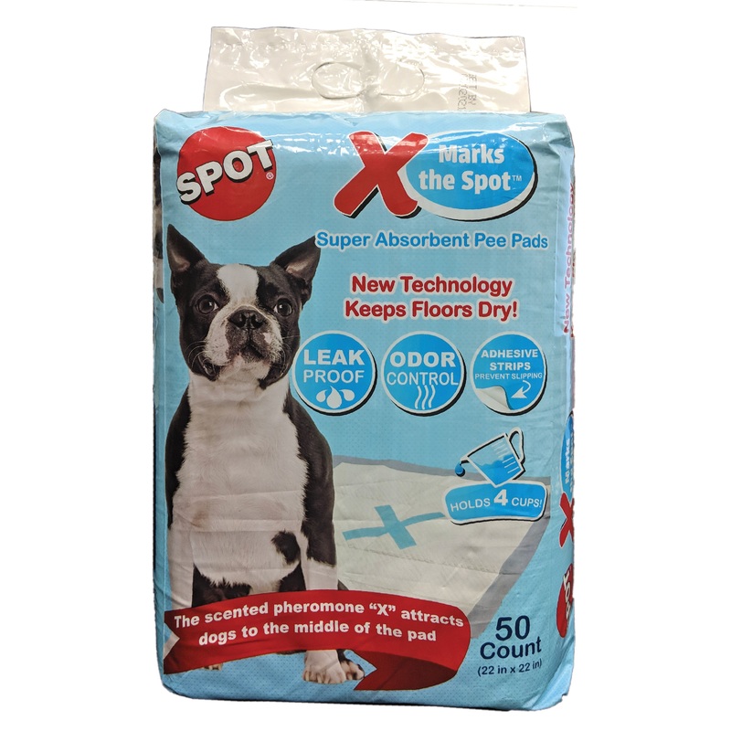 X Marks the Spot Suber Absorbent Pee pads have a scented pheromone X that attracts dogs to the middle of the pad. Adhesive strips on each corner pervents slipping an allows you to position the pads at a 90 degree for male dogs to protect both walls and floors. Five layers of absorbency holds up to 4 cups with a leak-proof inner.