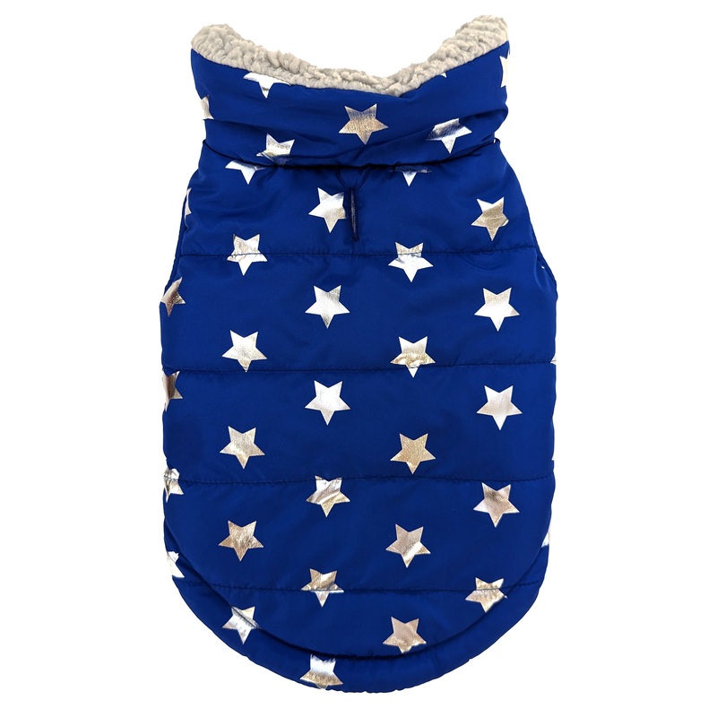 Starry night coat features luminous silver stars on a blue background. Reversible coat design offers 2 coats in 1. Leash Hole