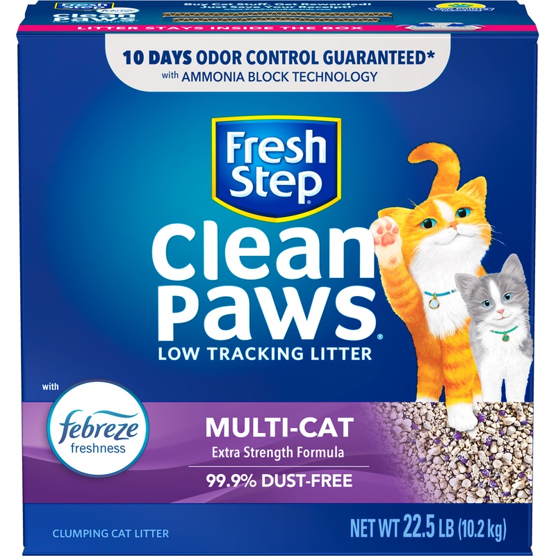 Fresh Step Clean Paws Multi-Cat Clumping Cat Litter is formulated with the power of Febreze to destroy even the busiest litter box odors, leaving behind a fresh, clean scent. Made with larger, premium clay particles, this litter stays inside the box to hel