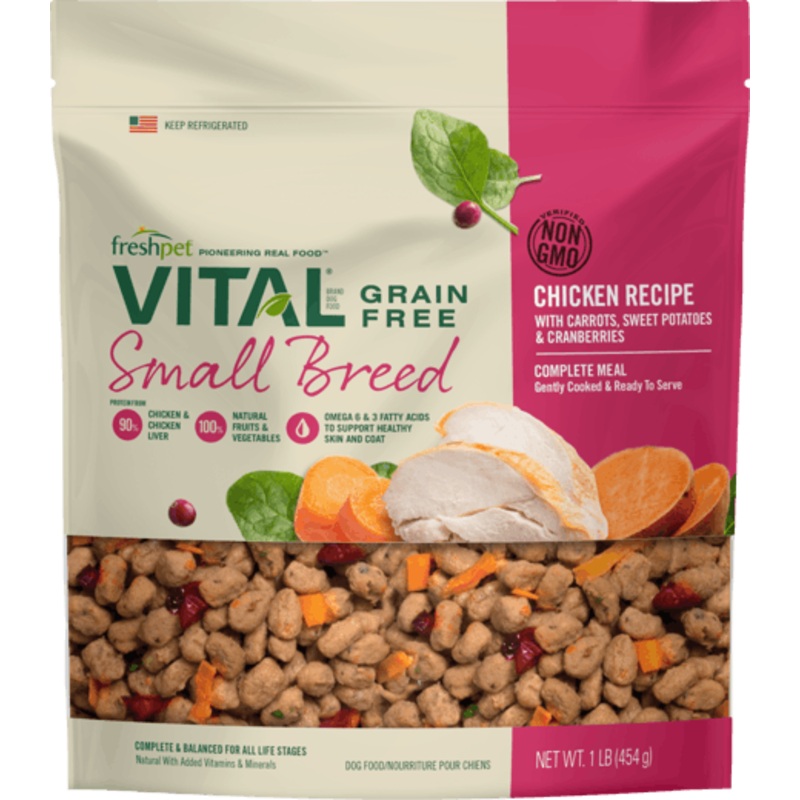 Bite-sized pieces made of 100% natural fresh chicken and antioxidant-rich sweet potatoes, carrots and cranberries, are specially crafted for the nutritional and high energy needs of small dogs. Verified Non GMO.
