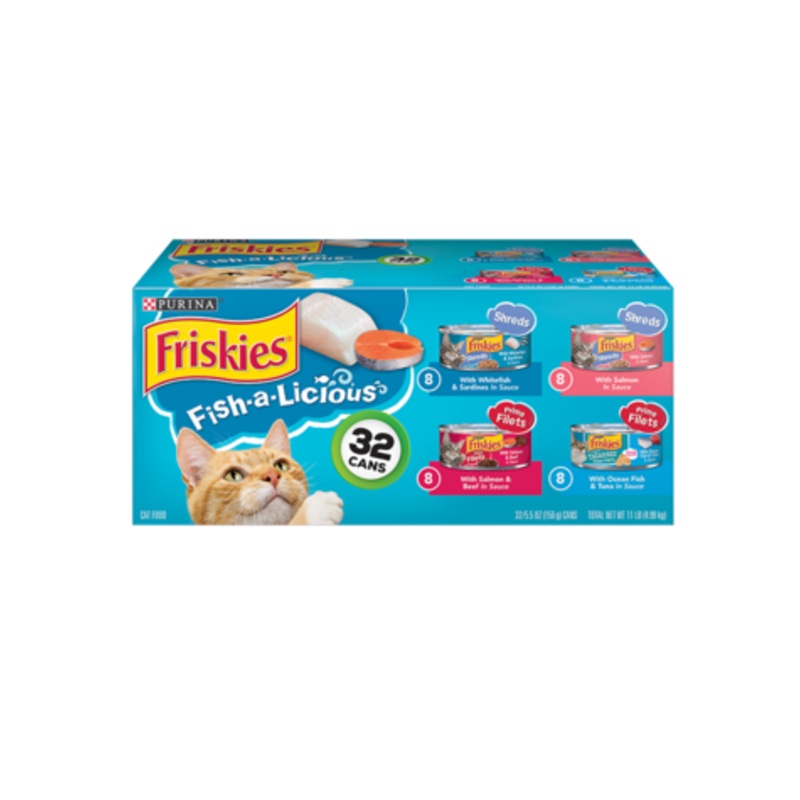 Tell your cat to grab a dish, its time for fish! This 32-count variety pack has eight cans each of Shreds With Whitefish & Sardines In Sauce, Shreds With Salmon In Sauce, Prime Filets With Salmon & Beef In Sauce, and Prime Filets With Ocean Whitefish & Tuna In Sauce.