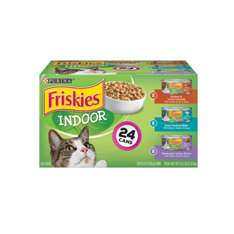 If youre looking for an adult cat wet food formulated for indoor cats, this is the variety pack for you. The Friskies Indoor Variety Pack contains eight cans each of Chunky Chicken & Turkey Casserole and Homestyle Turkey Dinner, each With Garden Greens In Gravy, and Saucy Seafood Bake With Garden Greens In Sauce.