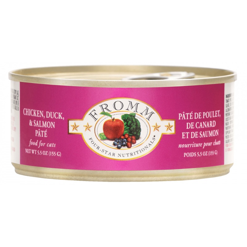 Perfect as a complete meal or accompanying your cats favorite dry food, Fromm Four Star Grain Free Salmon and Tuna Pate Canned Cat Food provides balanced and complete nutrition for all breeds and all stages of life. This recipe is made with high quality, finely minced chicken, duck, and salmon cooked together in a chicken broth. Fromm Four Star Grain Free Salmon and Tuna Pate Canned Cat Food is grain free and made with no artificial colors, flavors, or preservatives.
