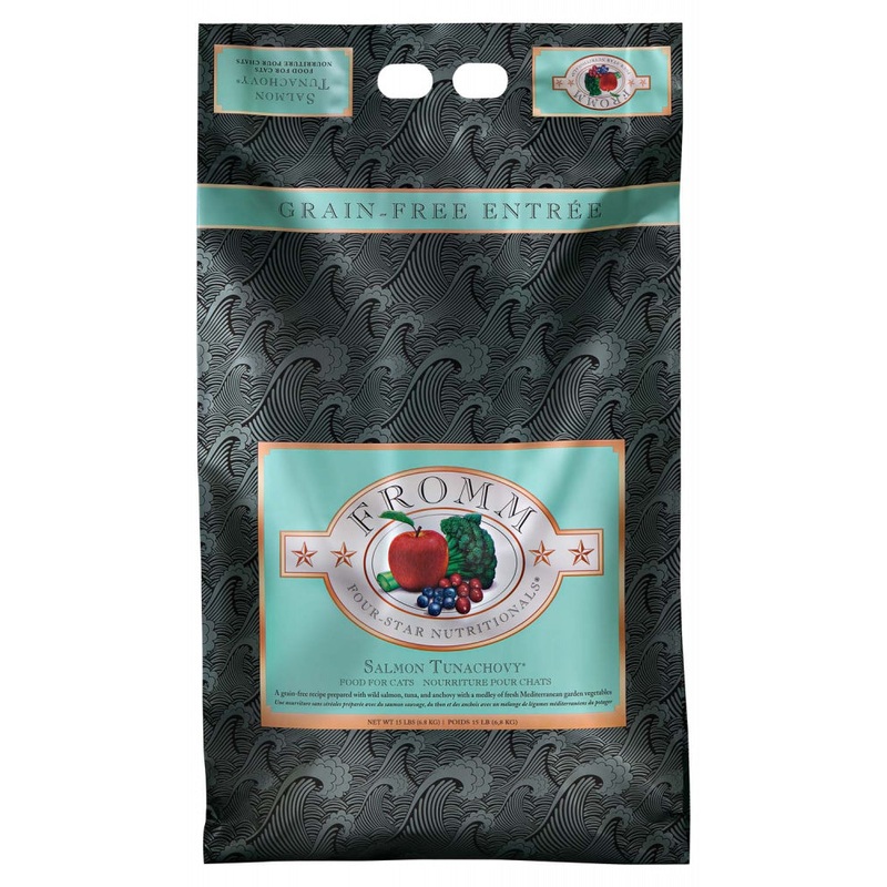 Fromm Four-Star Salmon Tunachovy Recipe is an enticing, grain-free entre with salmon, fish broth, tuna, and anchovy. This recipe is specially prepared to ensure consistency, quality, and superior taste in each and every bowl. Salmon Tunachovy Recipe provides complete and balanced nutrition for cats of all ages and can be alternated with other Fromm Four-Star recipes.