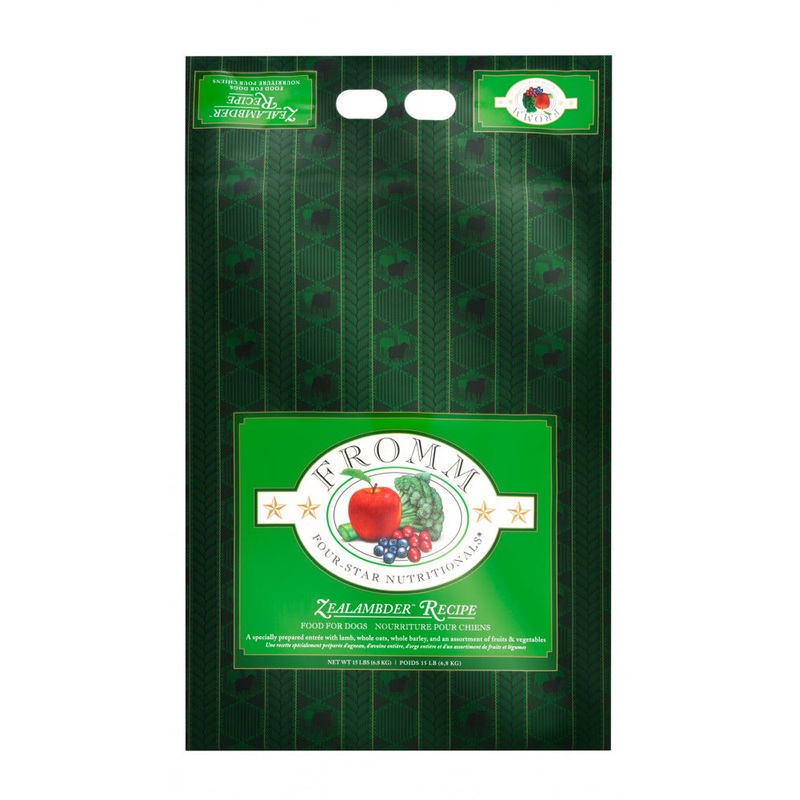 Fromm Four-Star Zealambder Recipe Food for Dogs is a delicious entre of lamb, whole oats, whole barley, and an assortment of fruits and vegetables. This distinctive blend is specially prepared to ensure consistency, quality, and superior taste in each and every bowl. Zealambder Recipe provides complete and balanced nutrition for dogs of all ages and can be alternated with other Fromm Four-Star recipes.