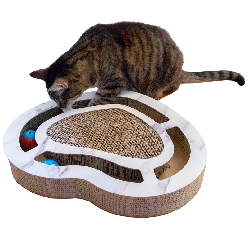 Meet your cats need to scratch, stretch, and play, all in one convenient location! This playful and interactive busy box design engages your kittys mind. Holes in the top and sides for multi-level access to the toy balls. Jingle-jingle" bell balls keep you