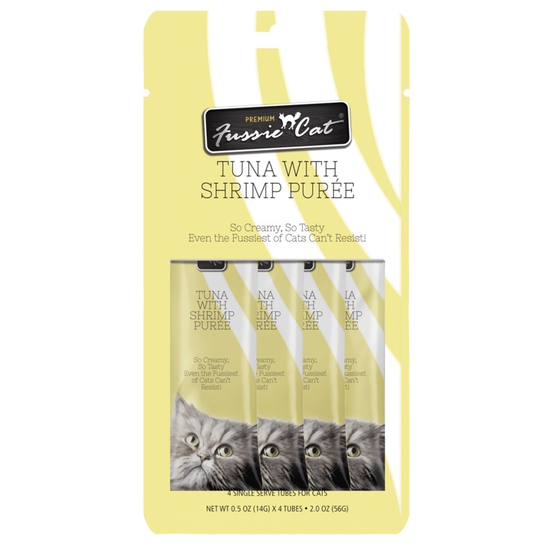 Fussie Cat Tuna with Shrimp Pure is love at first lick. Creamy in texture and rich in taste, this indulgent, flavorsome puree will make even the Fussiest of Cats demand more! Fussie Cat Tuna with Shrimp Pure is an easy-to-feed cat treat with essential vita