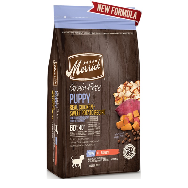 Merrick Grain Free Puppy Recipes provide balanced nutrition with real whole foods sourced from local farmers we know and trust. This natural, grain free formula dog food is ideal for all breeds of puppies and is specifically formulated to support healthy d