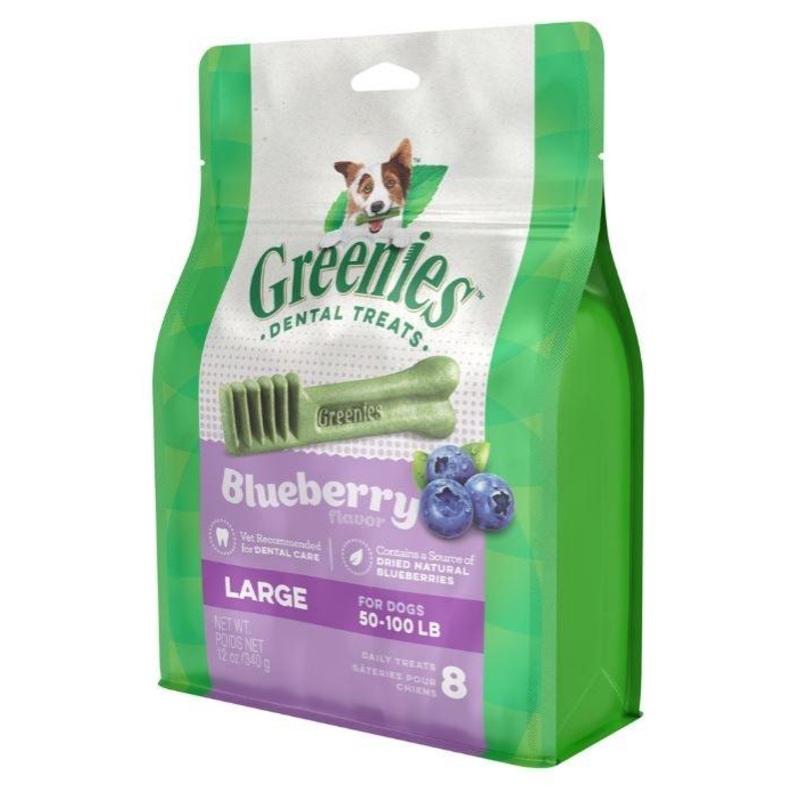 • Contains one (1) 12 oz. 8-count pack of GREENIES Large Natural Dog Dental Chews Blueberry Flavor