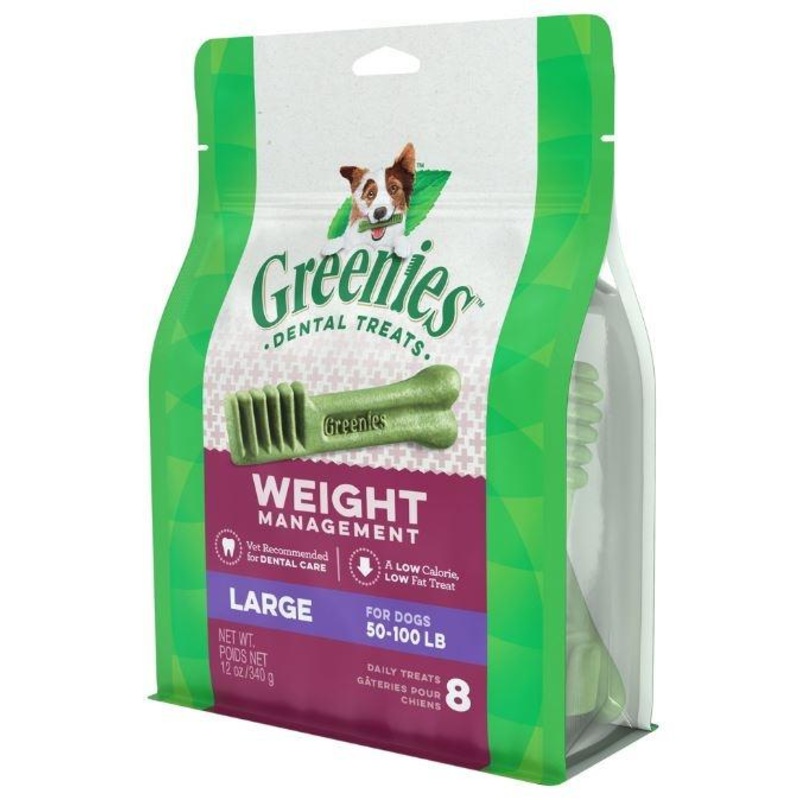 Made with a chewy texture to help fight plaque and tartar, Greenies Large Weight Management Dental Dog Chews are the perfect daily treat to help keep your pups teeth clean and their weight in check! Made with fewer calories as well as L-carnitine to help burn fat, this is one treat you dont have to feel guilty about! These treats are all natural with easy to digest ingredients topped with a delicious, mouth-watering taste!