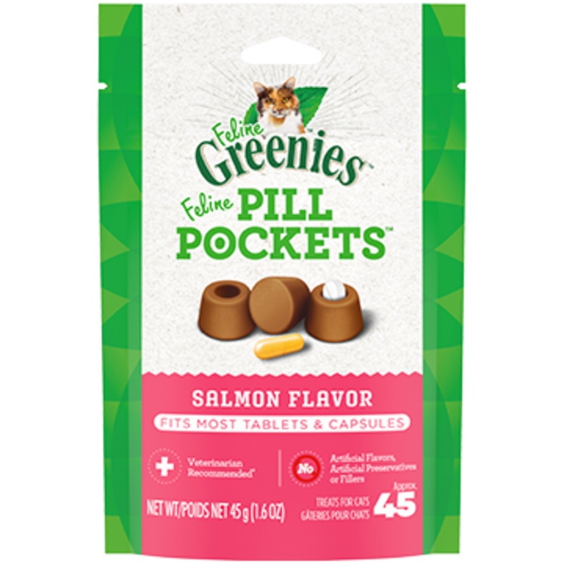 Take the stress and the mess out of giving your cat medicine! FELINE GREENIES PILL POCKETS Treats have built-in pouches to easily hide tablets or capsules and ensure your cat takes their medication. Made with Natural Ingredients plus minerals and trace nutrients, PILL POCKETS are a healthy alternative to using human food to disguise your kittys meds. Just drop your cats medication into the pouch, pinch it closed, and share with your cat. Just like that, the treat (and medicine) disappears. Your cat is smart, but youre smarterTurn Pill Time into Treat Time!