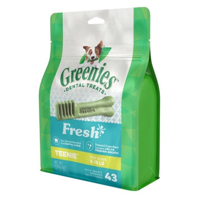 Made with a chewy texture to help fight plaque and tartar, Greenies Teenie Mint Dental Dog Chews are the perfect daily treat to help keep your pups teeth clean! These dental treats are all natural with easy to digest ingredients topped with a delicious, mint taste no dog can resist!