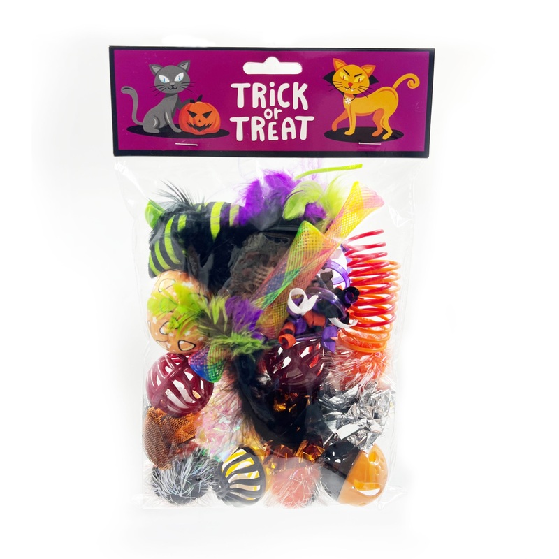 Halloween Cat Toy Mega Multipack 21 PiecesA haunted house of toys in one spook-tacular bundle! This Halloween Cat Toy Multipack is bursting with 21 festive, frightfully fun toys to keep your feline entertained all season long. From plush pumpkins and sugar