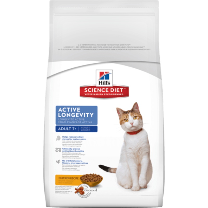 Hill'sScience DietAdult 7+ Active Longevity cat food provides Precisely balanced, easy-to-digest nutrition to help your older cat live a long, healthy life.Helps reduce kidney stress for mature catsClinically proven antioxidant benefitsNo artificial colors