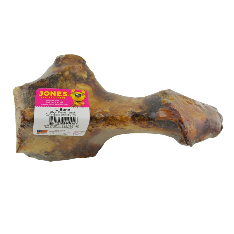 Jones' L Bone is the beef funny bone, but there is nothing funny about the delicious meaty tidbits and hours of chewing this bone provides. It is the elbow cut from USA-raised beef. It is dipped in liquid smoke and oven-baked to perfection, with no artific