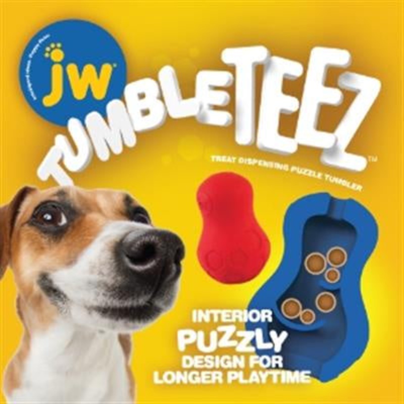 JW Tumble Teez is designed to sporadically dispense treats as a dog plays with the toy. Intelligently designed, the Tumble Teez has a patented internal shelf design that works like a maze for the treat to travel through as a dog nudges and paws at the toy.