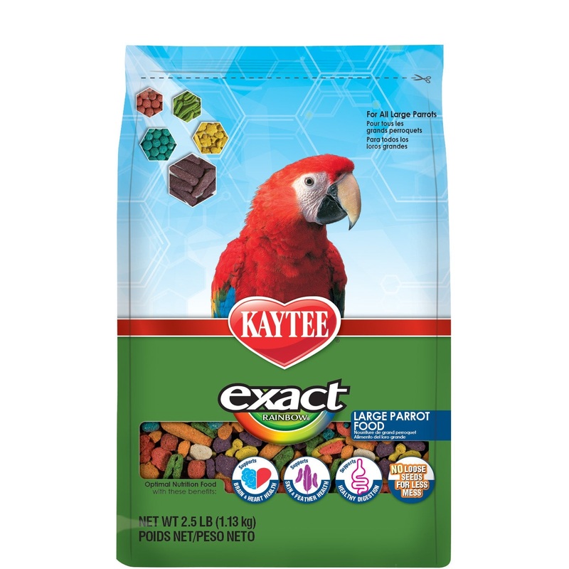 Kaytee exact Rainbow Large Parrot FoodKaytee exact Rainbow Large Parrot food is a premium extruded food and has been the recognized nutritional leader by avian nutritionists, veterinarians and breeders since its introduction over 25 years ago. Each nugget