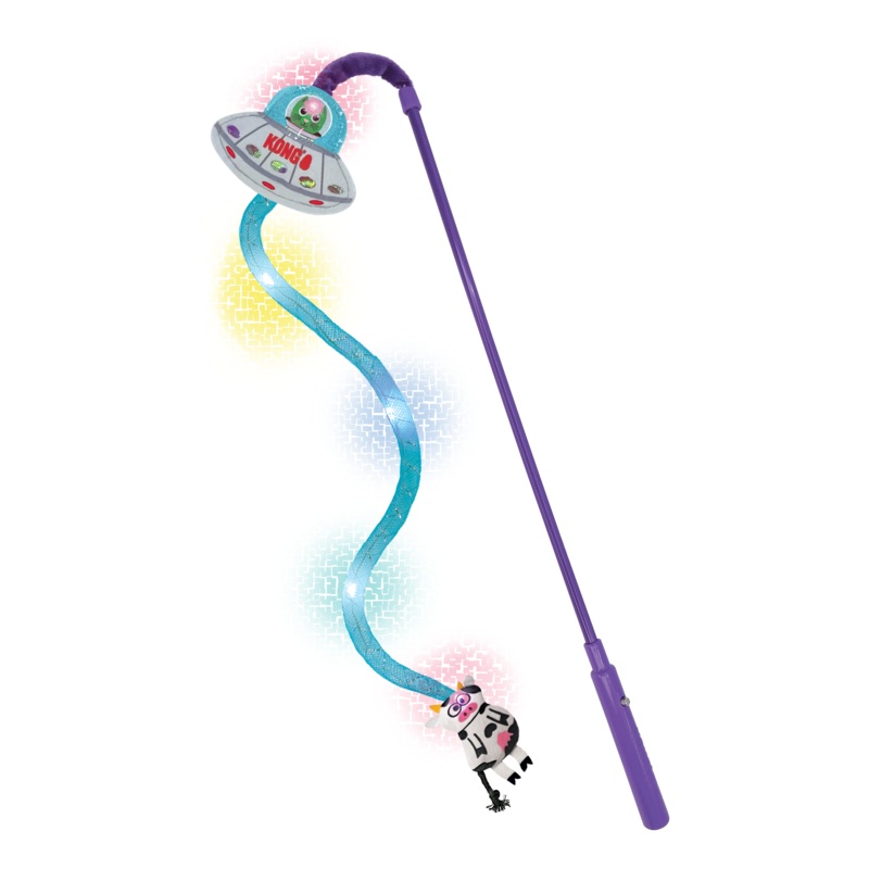 KONG Teaser UFO (Unidentified Feline Object) features lights in the beam between the KONGship and cow. Click for steady glow, slow twinkle or fast twinkle for an out-of-this world interactive adventure. Bouncing bovines motion invites instinct-satisfying b
