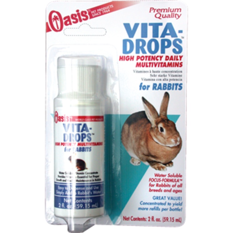 Premium Quality High Potency MultivitaminsFocus-Formula for RabbitsInsures balanced nutritional daily intakeFor all Breeds and AgesMade in U.S.A.Oasis Vita-Drops are a convenient way to assure your rabbits are receiving their daily intake of vitamins essen
