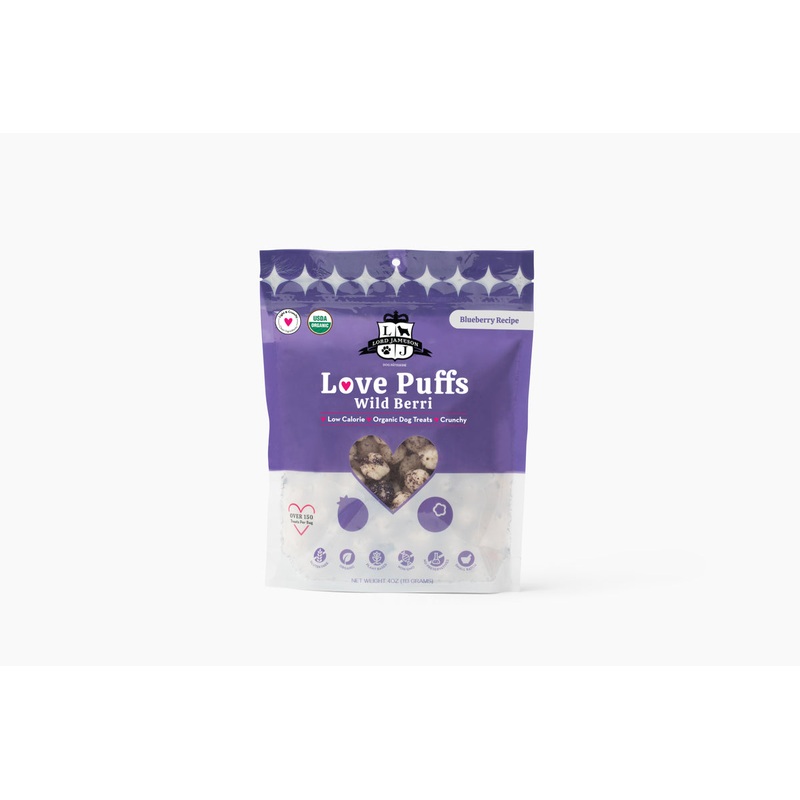Love Puffs Wild Berri – A bright blend of organic blueberry and coconut! Lord Jameson is thrilled to offer a brand-new collection unlike anything we’ve offered before! Love Puffs are lovingly crafted to offer a light and crunchy treating experience without any artificial flavors or colors. We roll each ball in organic, plant-based colored coconut shreds. Our Love Puffs are low-calorie & low-sugar. Perfect for all dogs – whether they’re watching their waistline or not! And there’s plenty to share with over 150 balls per bag!