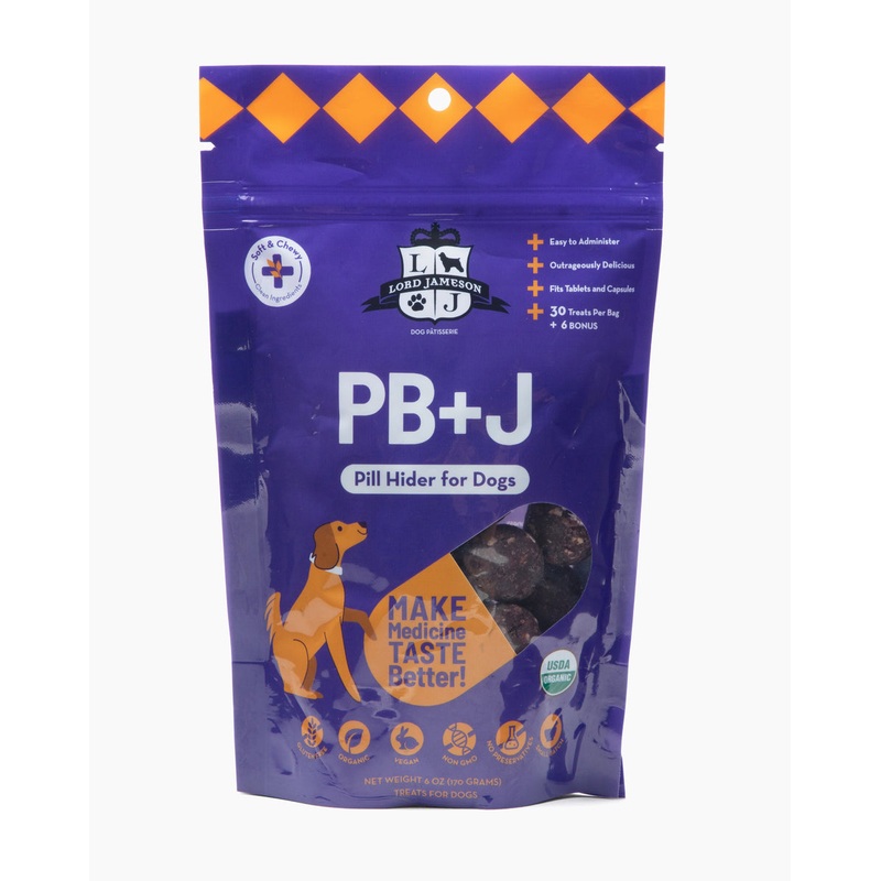 Make medicine taste better with our PB+J flavored Pill Hider Dog Treat. Finally, a CLEAN way to make administering your dog’s medications an easy and tail-wagging experience! Just stick the pill or capsule inside one of our pill hider treats, pinch the treat closed to form a soft moldable pill hider, and feed to your dog! Watch your dog’s tail wag as they beg for more! Lord Jameson is thrilled to offer dog parents a CLEAN Pill Hider designed with exciting and robust flavors to mask the bitter taste of their dog’s medication. Our Pill Hider recipes are great for dog’s with or without allergies or sensitivities! Our recipes are 100% preservative-free.