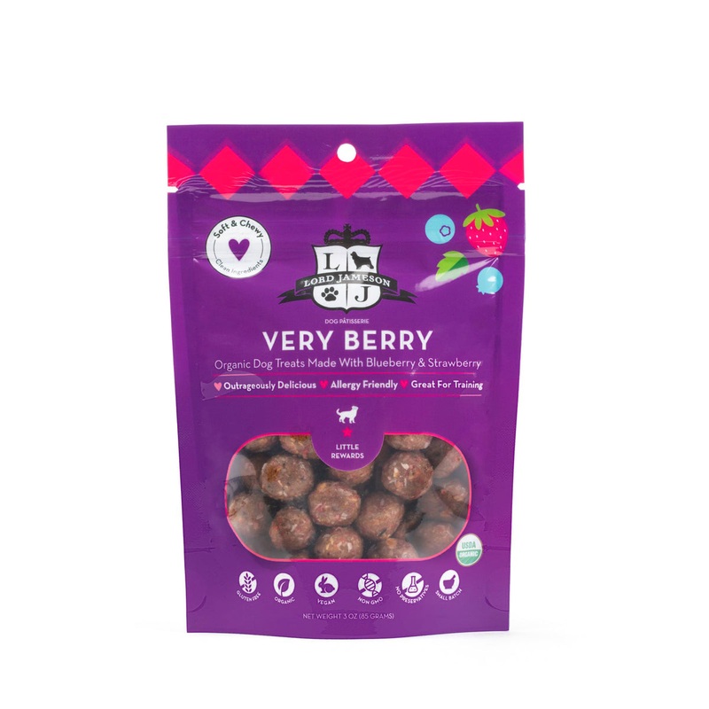 Very Berry offers a berry bite of happiness! The most exquisite combination of sumptuous strawberry paired with bright blueberry. Both blueberries and strawberries are ingredients packed full of antioxidants. Little Rewards Made With Love! Lord Jameson has designed the Small Breed Collection specifically to better fit smaller breeds with little mouths. The Small Breed Collection is comprised of three signature recipes each formulated with delicious, vitamin-rich, whole food ingredients.