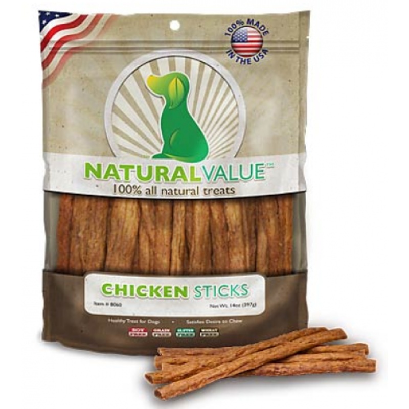 Natural Value Chicken Sticks are wheat, corn, soy, gluten and grain free, and contain no by-products. These soft-chew treats are perfect for any age or size dog.