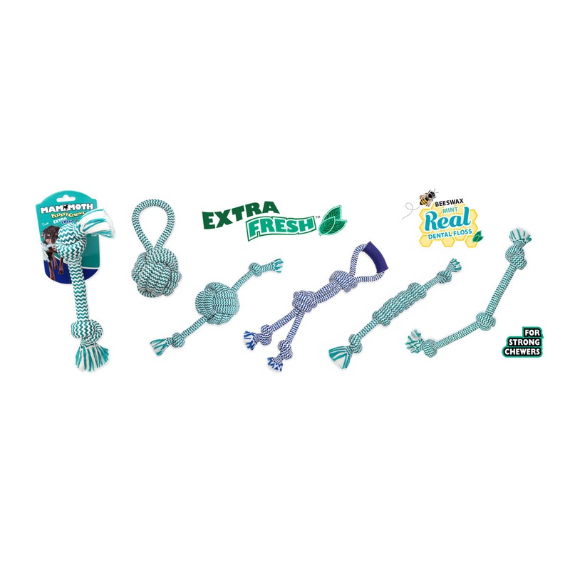 Mammoth Flossy Chews EXTRA FRESH has REAL dental floss formulated with natural beeswax and mint to help freshen breath and control tartar while pets enjoy hours of interactive playtime! This toy is perfect for maintaining good dental hygiene while playing, tossing, and tugging.