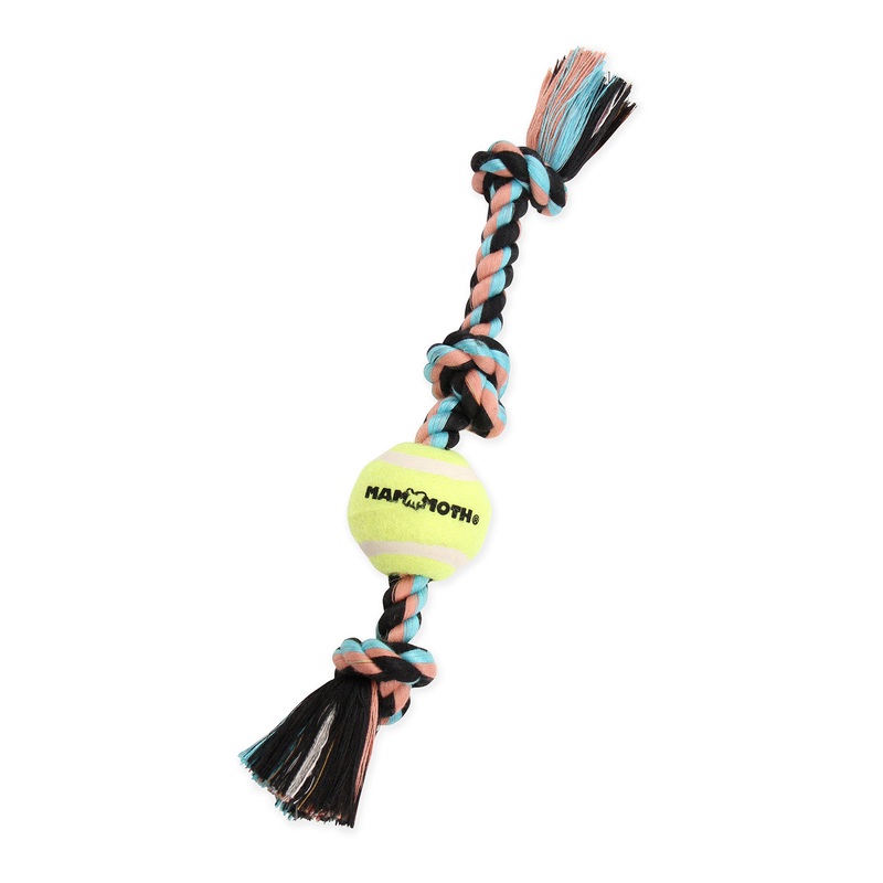 Mini 11″ Color 3 Knot Tug w/Mini Tennis Ball. Mammoth Flossy Chews are made from premium quality cotton-poly yarns with an extra strength tennis ball that is ideal for interactive playing, tossing and tugging. Flossy Chews dog toys encourage playtime and bonding between you and your pet while helping to maintain good dental hygiene. Toss. Tug. Floss. Great for small dogs.