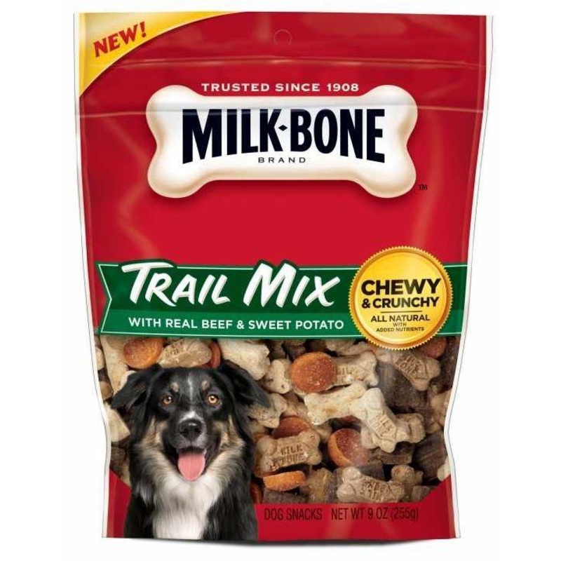 Feed 5-7 treats per 10 pounds of body weight. Milk-Bone Trail Mix treats are intended for intermittent or supplemental feeding only. Please reduce the amount of food by about 10% daily when feeding the recommended amount of this treat. Always monitor your pet while treating. Fresh drinking water should always be available.