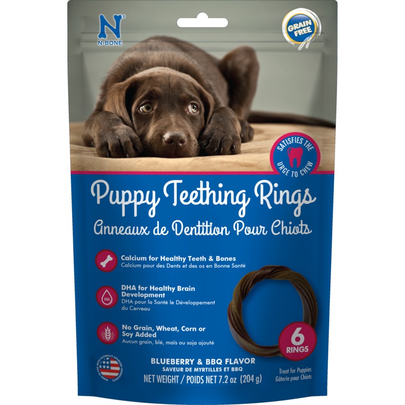 N-BonePuppy Teething RingsGrain-Free are easy for floppy puppy paws to hold onto and provide a soothing and appropriate outlet for chewing. Formulated with DHA and calcium to support your puppys unique nutritional needs, our delicious grain-free blueberry & bbq flavored rings are pliable and wont damage immature teeth or upset tummies that have gluten sensitivity.