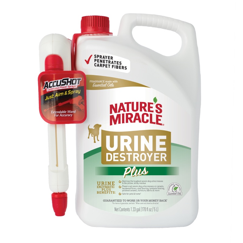Nature's Miracle Urine Destroyer for dogs is tough on strong dog urine and the yellow, sticky residue that comes along with it. The bacteria-based formula produces enzymes when it comes in contact with bio-based messes to target urine and freshens with a l