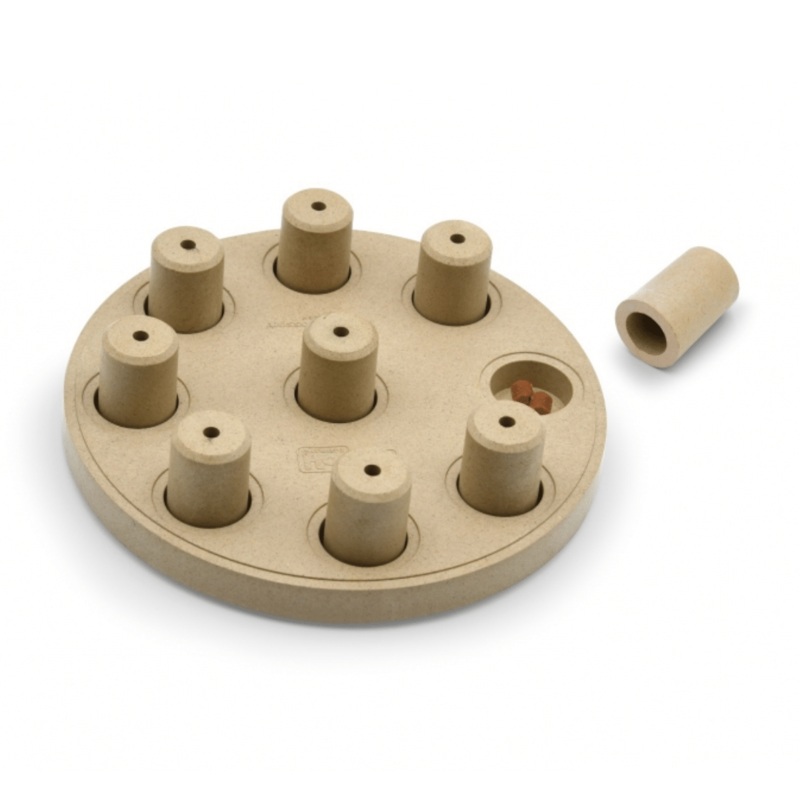 - This interactive dog puzzle features 9 hidden compartments that are covered by 9 removable peg pieces. Hide your pup’s favorite treats in the compartments. Watch as your dog learns to nudge and paw away the pegsto reveal the reward!