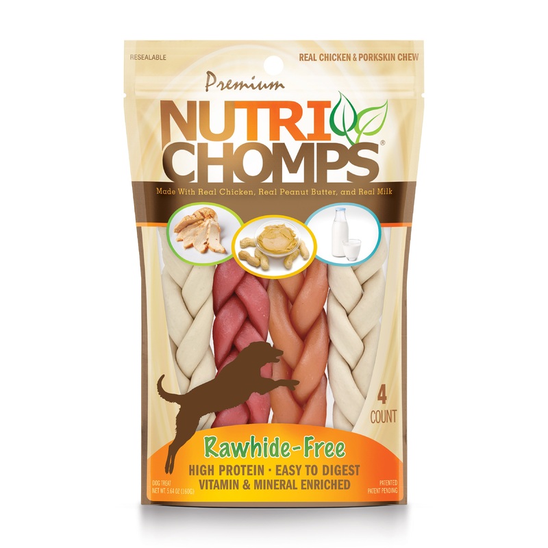 Premium NutriChomps 6 Assorted Milk, Chicken and Peanut Butter Braids are rawhide-free and naturally delicious. These premium chews are made with real chicken and pork skin along with real milk plus peanut butter for a high-protein, high fiber, and low car