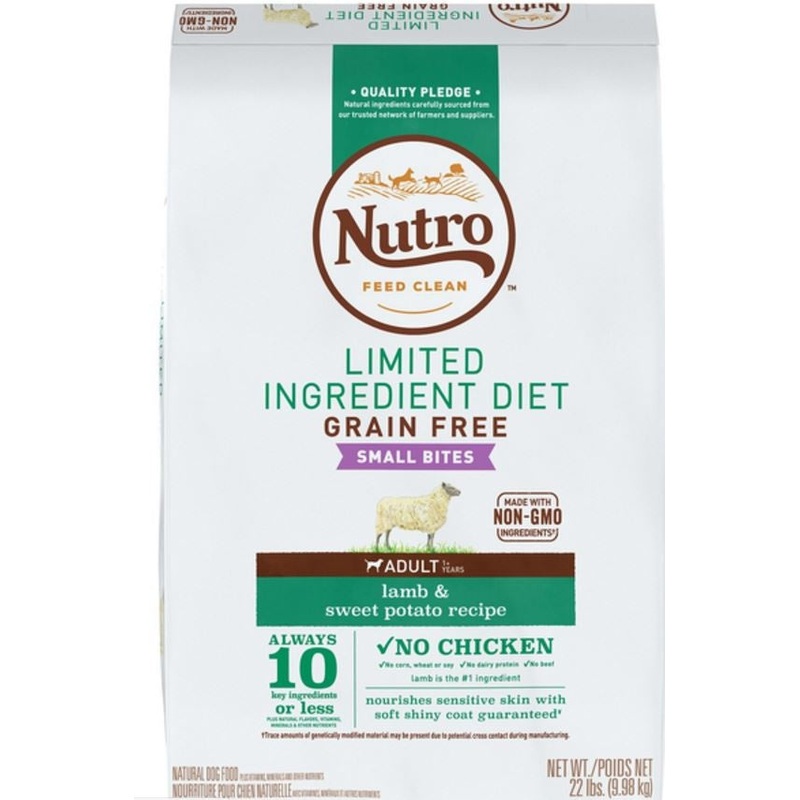 Made with just 10 key ingredients or less, including real meat, with natural flavors, vitamins and nutrients, each recipe contains zero traces of chicken, beef, corn, wheat, soy and dairy. Completely grain-free, and made with real high quality lamb and sweet potato, Nutro Limited Ingredient Diet Adult Lamb and Sweet Potato tastes great and contains everything needed for a healthy digestive system and a beautiful, glossy coat., specifically formulated for your small breed dog, with a smaller kibble for easy chewing. Nutro Limited Ingredient Diets also follow the Nutro Feed Clean philosophy, always made with non-GMO ingredients and is made with no artificial flavors, colors or preservatives