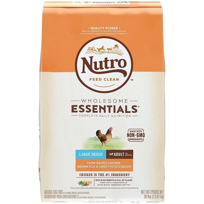 Nutro Wholesome Essentials Large Breed Adult Farm-Raised Chicken, Brown Rice & Sweet Potato Recipe Dog Food always starts with great tasting, farm-raised chicken as the first ingredient and contains high-quality nutrients like glucosamine and chondroitin.